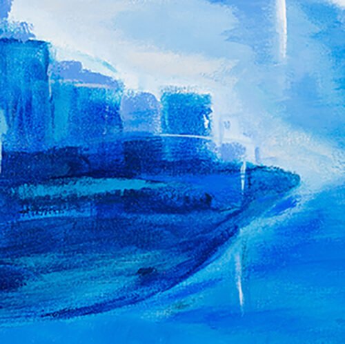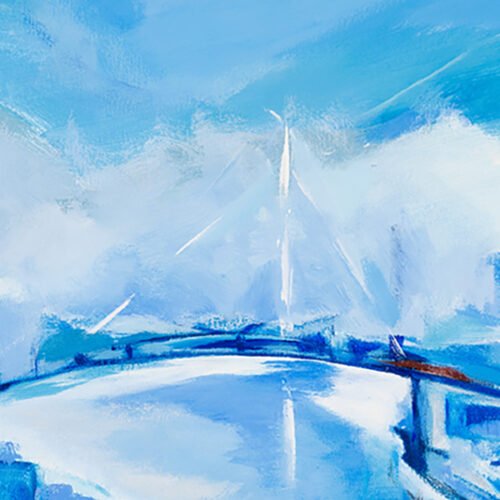 With soft blues and lavenders, she captured its graceful arc and the life flowing beneath, blending memory and motion. This painting reflects her love for architecture and the quiet power of places that bring us together.